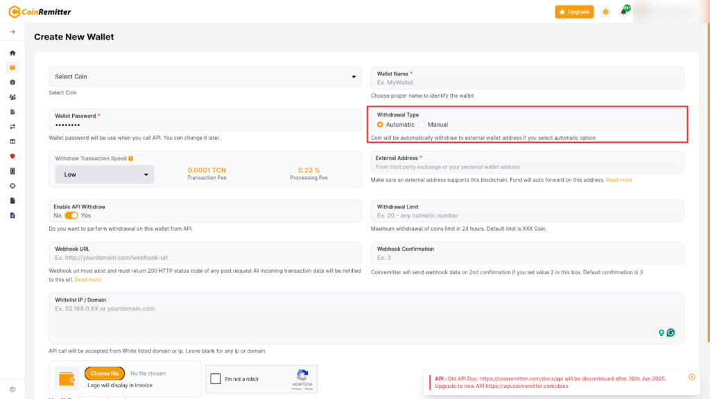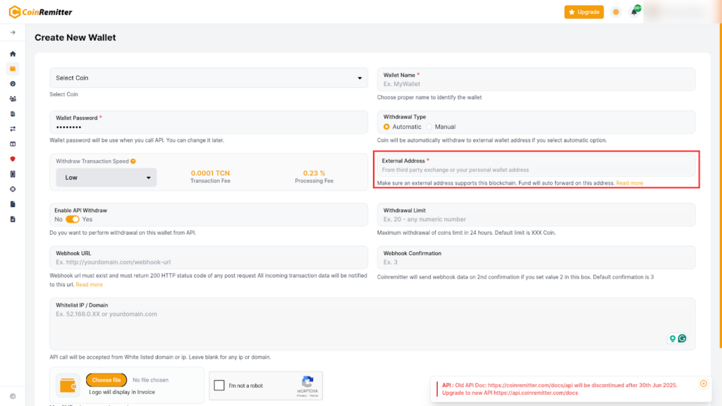 Internal (or CoinRemitter) wallets are operational within CoinRemitter’s ecosystem, while external wallets are third-party wallets that operate outside it.
