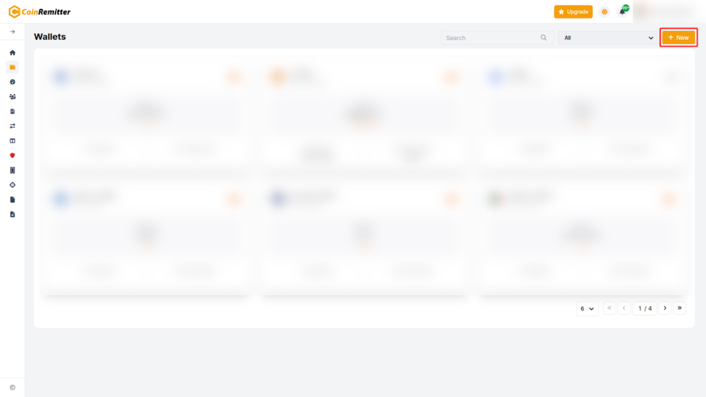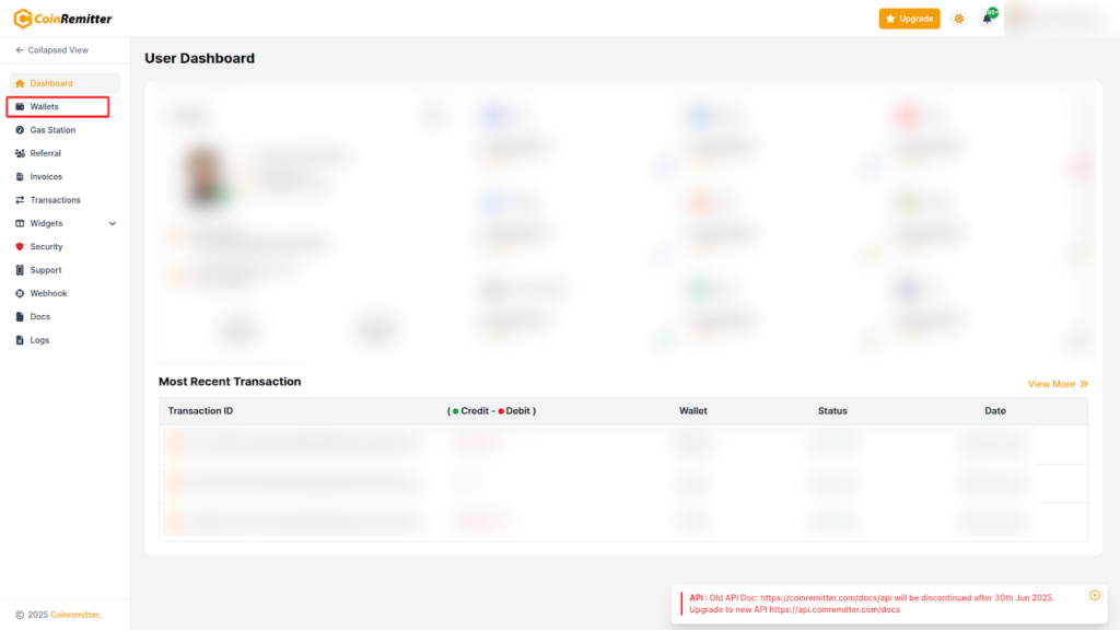 - Log in to your CoinRemitter account and click ‘Wallets’ from the left panel of the Dashboard.