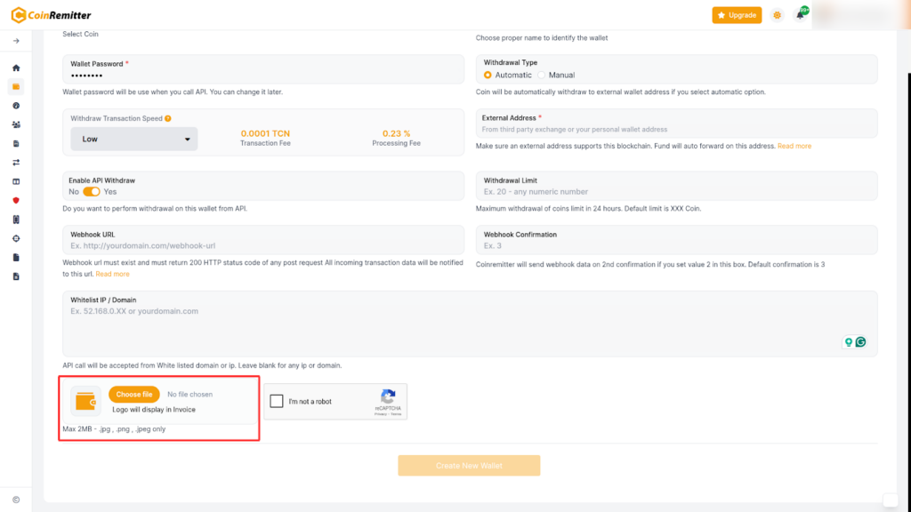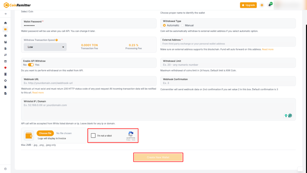 - Complete the captcha verification, and click the ‘Create New Wallet’ button.