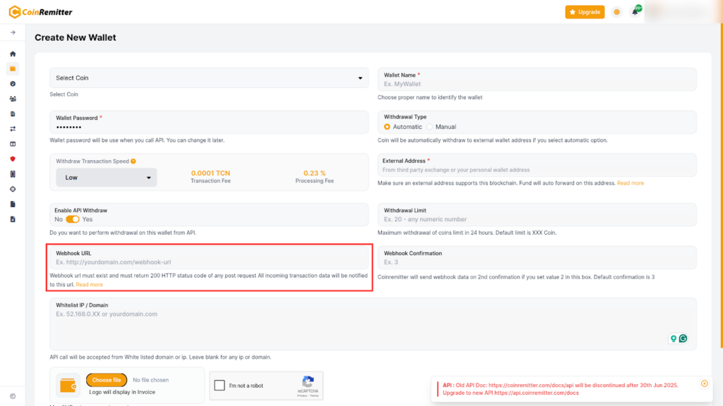 - Enter a valid webhook URL that returns a 200 HTTP status code. All payment data (Deposit / Withdrawal ) of this wallet address will be sent to that Webhook URL.