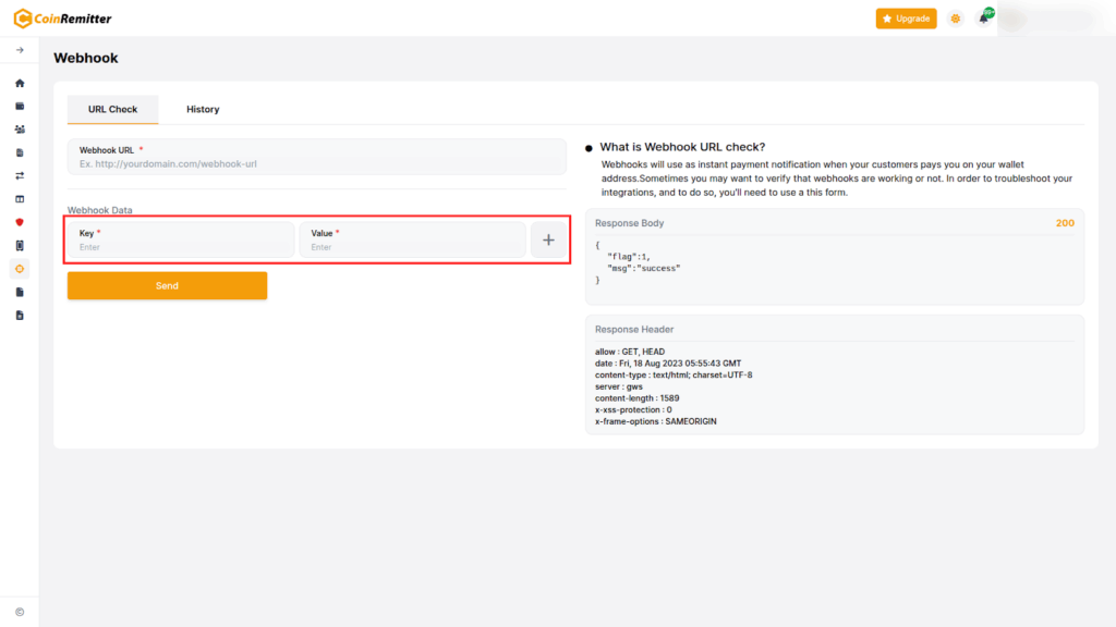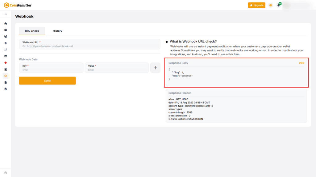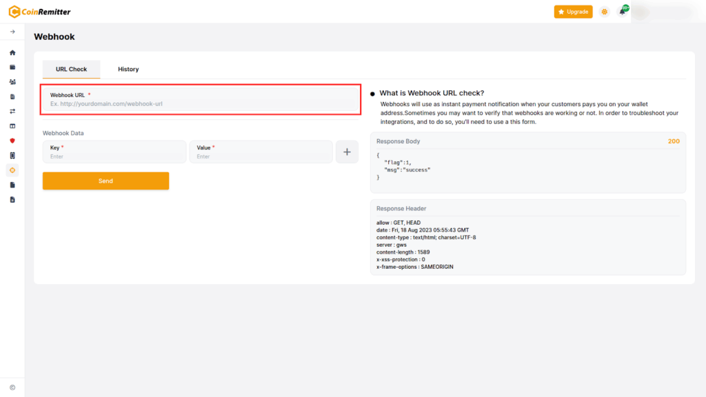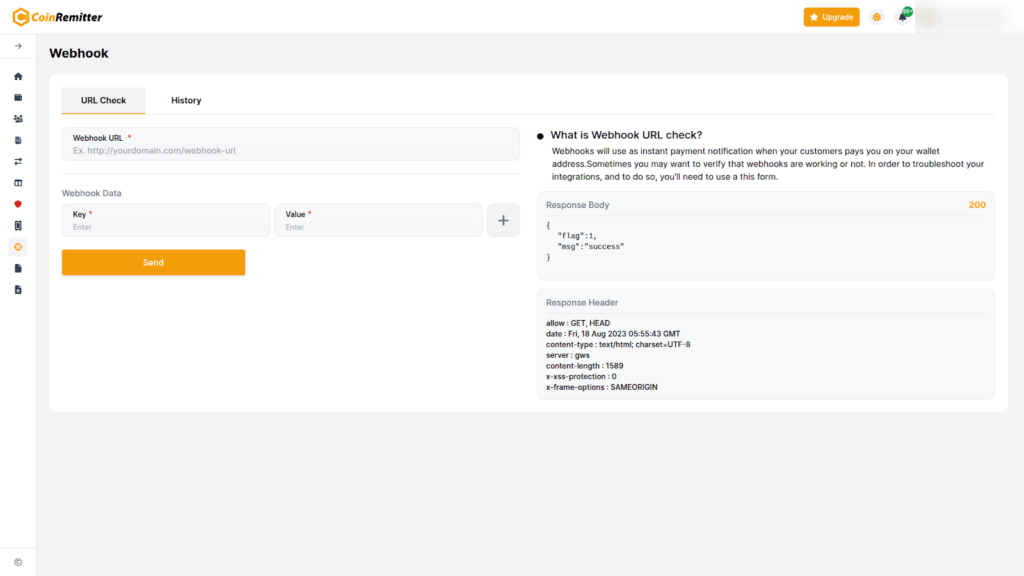 Webhook is one of the CoinRemitter functionalities that improves the experience of accepting cryptocurrency payments. You can add a webhook URL of your website in the general wallet settings. When someone deposits funds into the same wallet, you will receive payment data at the webhook URL you entered.